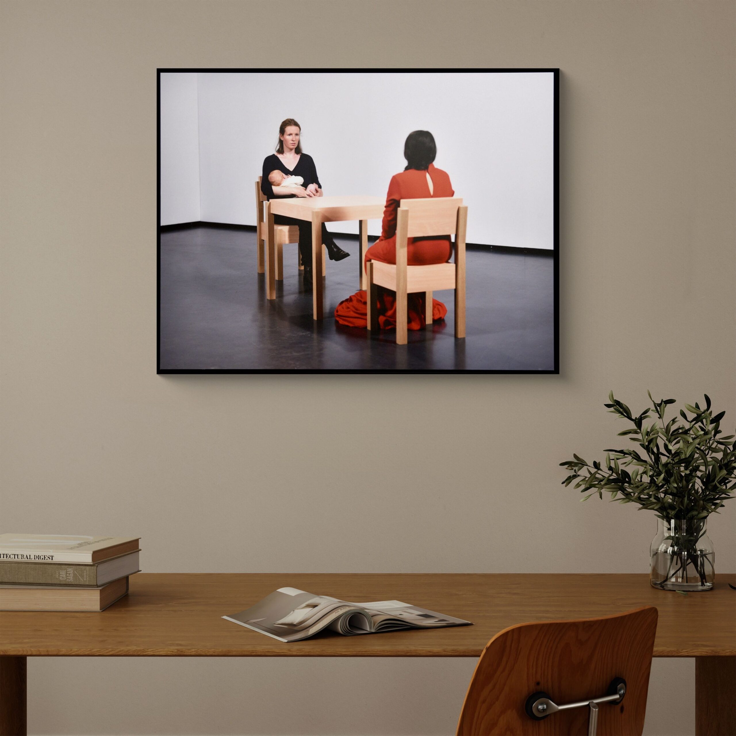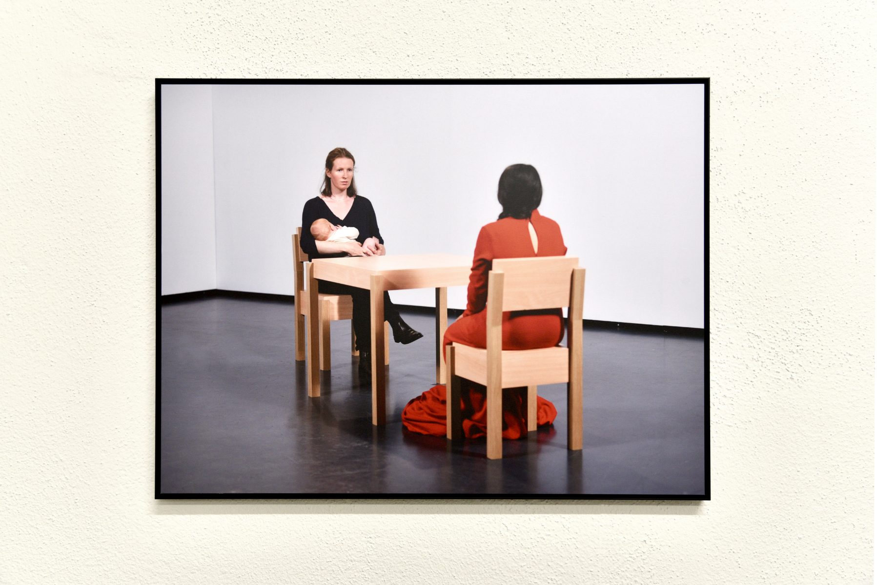 The slow motion video shows me in a slow tracking shot breastfeeding my daughter Ada in an exhibition-like setting. We are sitting opposite a woman in a red dress who resembles the artist Marina Abramović in her performance “The Artist is Present” (MoMA 2010). Ada vs. Abramović is intended as a positive counter-statement to Abramović’s condescending commentary.