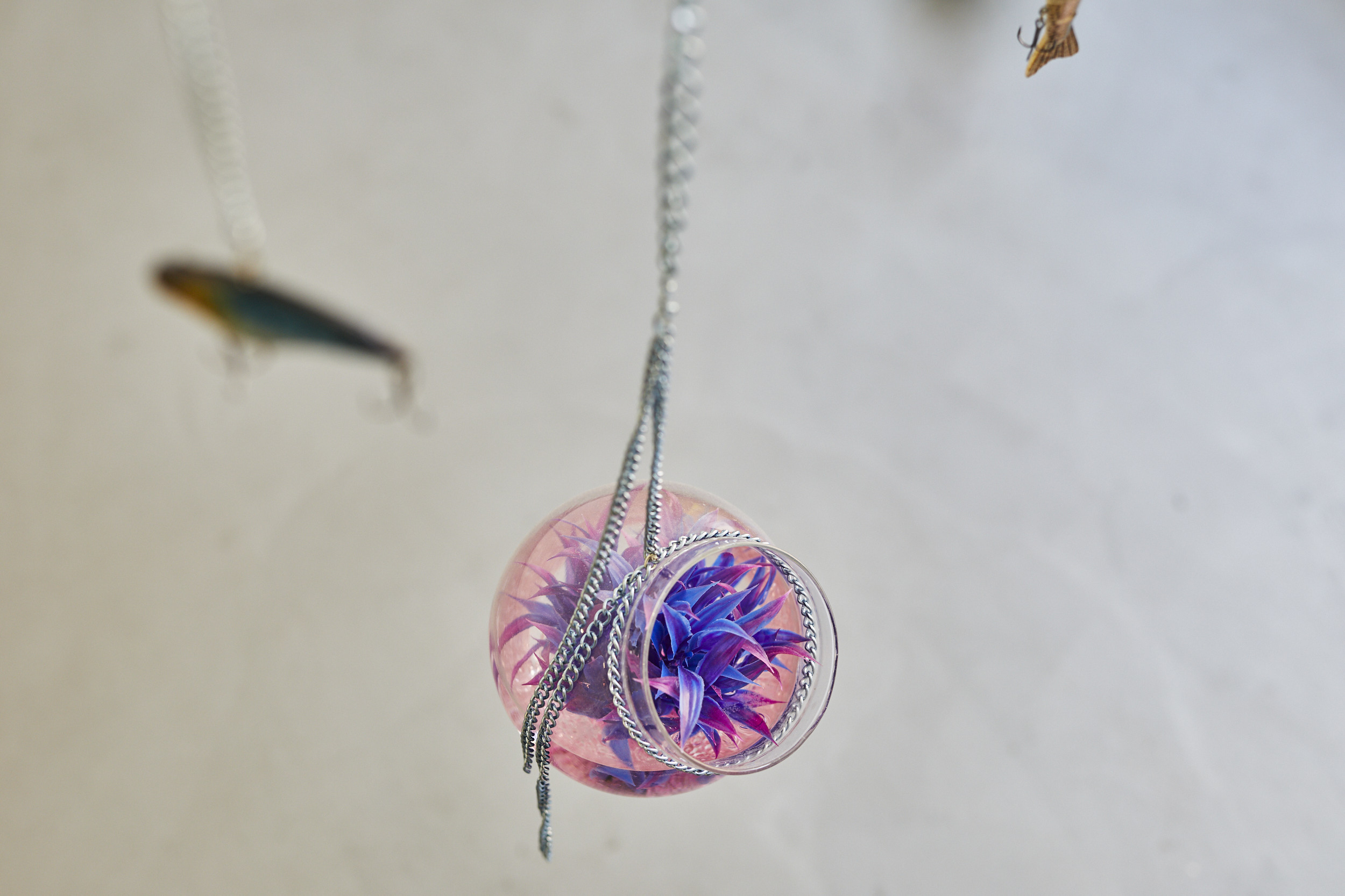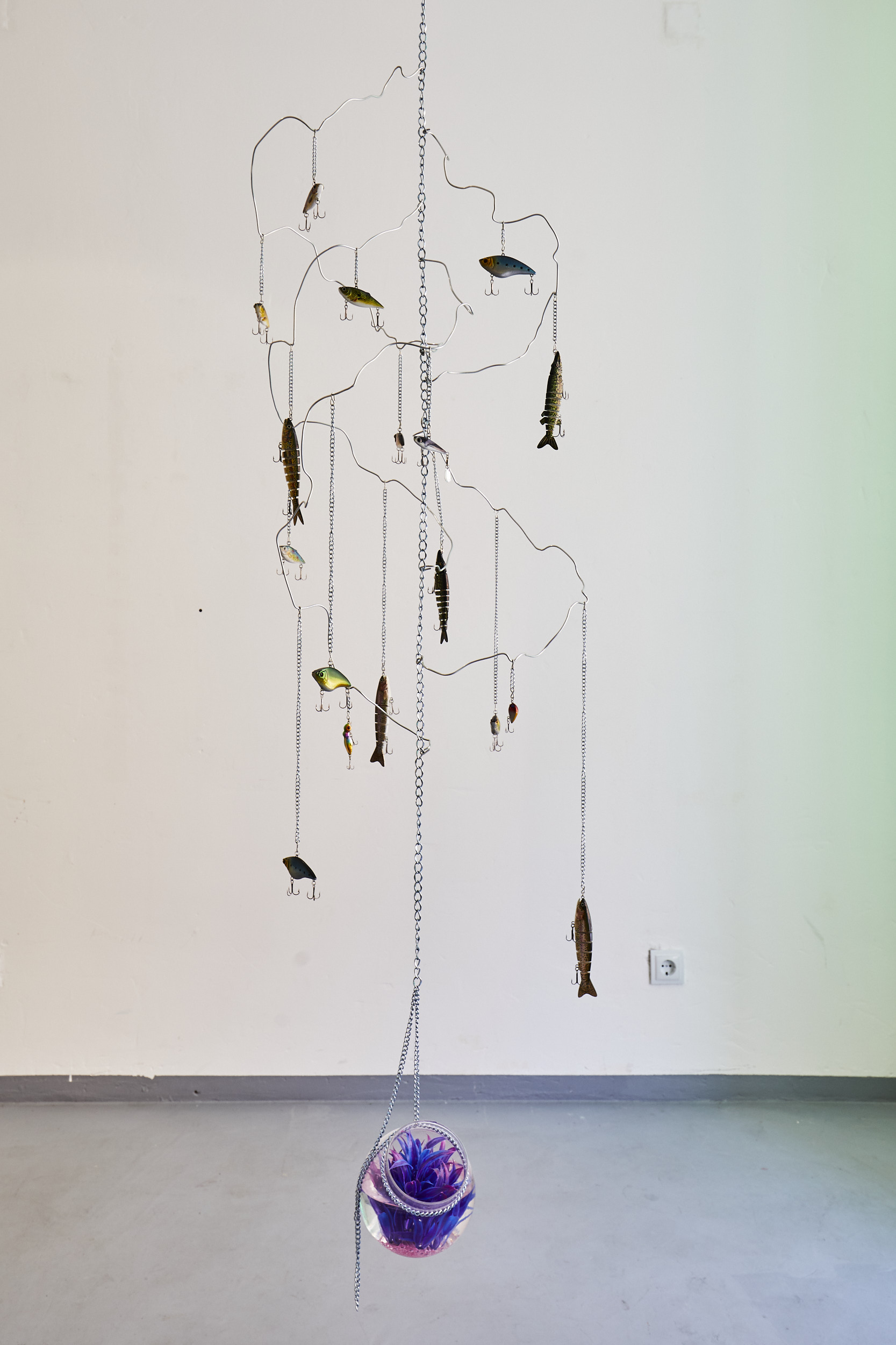 | Material | Fishing lure, wire, glass ball, water, artificial aquarium plant |